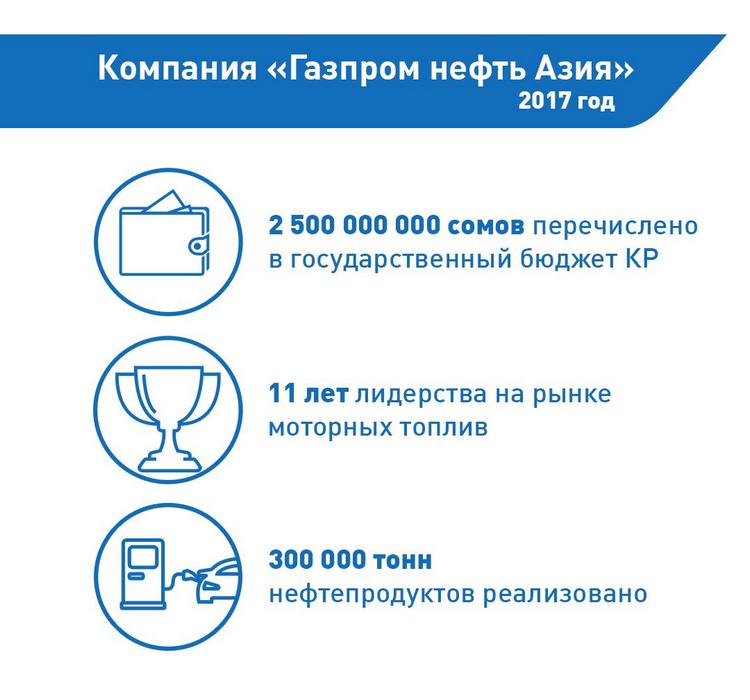 Вот уже 11 лет компания «Газпром нефть Азия» занимает лидирующие позиции на топливном рынке Кыргызстана. 2017 год не изменил этой тенденции. Совокупный годовой оборот реализованных нефтепродуктов — только по предварительным данным — превысил 300 тысяч тонн, что позволило пополнить бюджет страны на 2,5 миллиарда сомов.