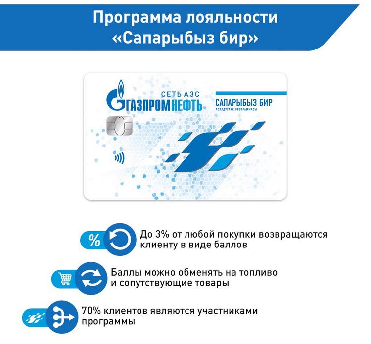Бонусы обеспечивает программа лояльности «Сапарыбыз бир». Имея на руках карту участника, водитель автоматически получает скидку до 3 процентов при любых покупках в магазине при АЗС «Газпромнефть» в виде баллов. Баллы попадают на карту, и позднее их можно использовать при оплате топлива или какого-нибудь товара в магазинах сети АЗС. Приятно, правда?