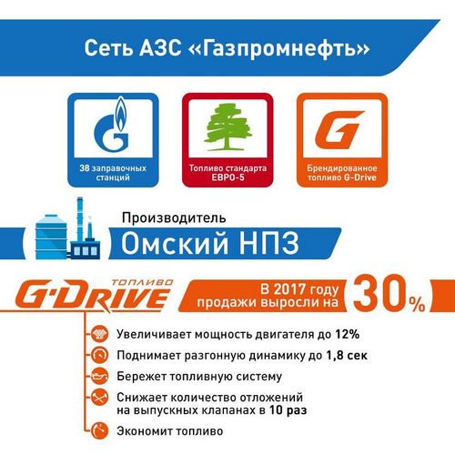 Два года назад сеть АЗС «Газпромнефть» (сегодня это 38 современных заправочных станций) полностью перешла на реализацию нефтепродуктов экологического класса Евро-5. С 2014 года в сети реализуется топливо G-Drive с улучшенными характеристиками.