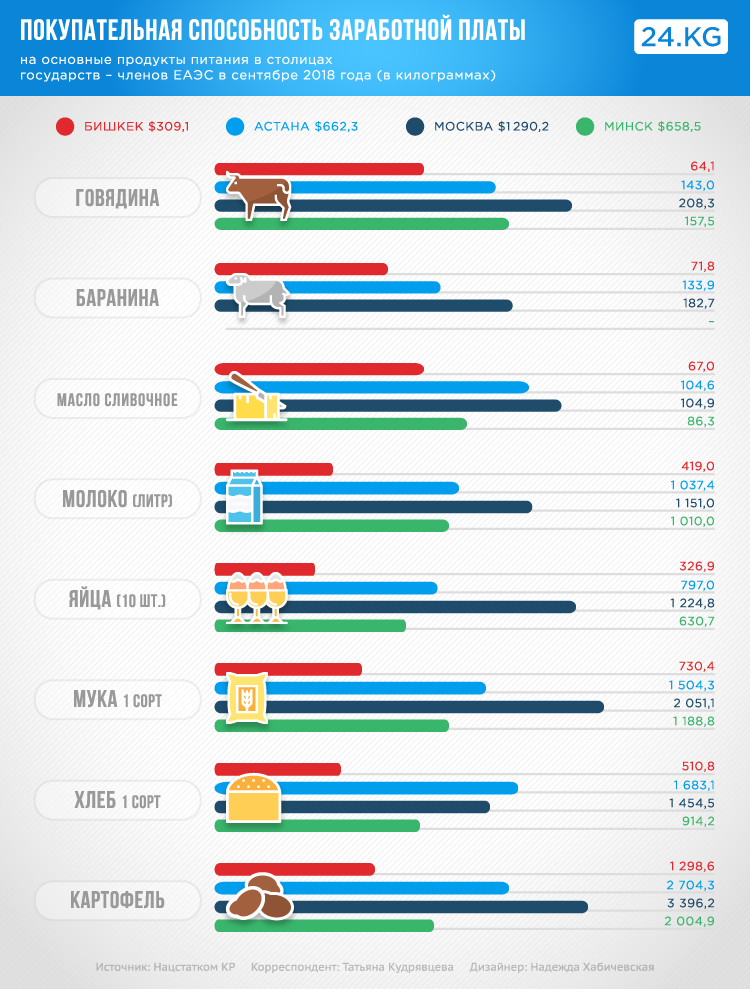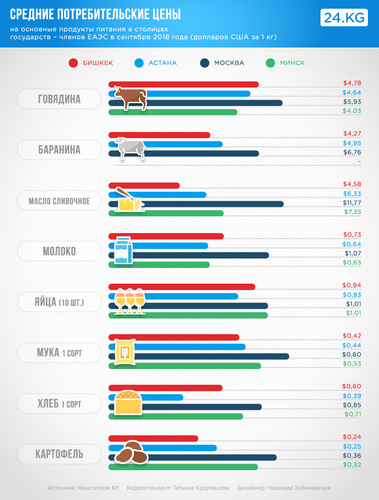 Нацстатком проанализировал цены на основные продукты питания в четырех городах Евразийского экономического союза — Бишкеке, Астане, Москве и Минске. Оказалось, что цены в столице Кыргызстана практически схожи с другими столицами, а вот зарплаты значительно меньше.