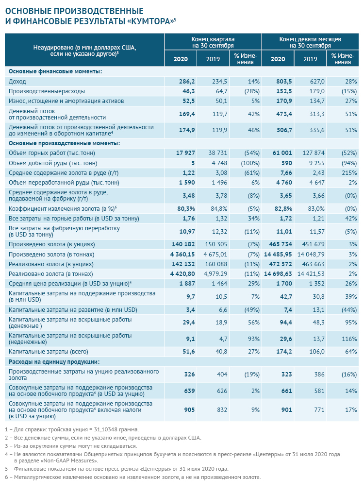 Содержание золота в поставляемой на фабрику руде в третьем квартале 2020 года в среднем составляло 3,48 грамма на тонну при коэффициенте извлечения золота из руды 80,3 процента. В III квартале 2019 года показатели составляли 3,78 грамма на тонну и 84,8 процента.