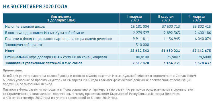 1 сентября 2020 года компания «Кумтор Голд Компани» перечислила 78 миллионов 468 тысяч 300 сомов (эквивалент $1 миллиона по официальному курсу НБ КР на 01.09.2020) на счет Министерства здравоохранения Кыргызстана на ремонт лечебных учреждений и оснащение их медицинским оборудованием.