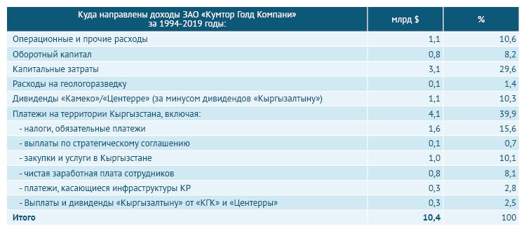 Если пересчитать это в сомах по текущему курсу, то 347 миллиардов 844 миллиона сомов попали в экономику Кыргызстана за время работы «Кумтора» в виде налогов, обязательных платежей, выплат по стратегическому соглашению, на закупки товаров у местных производителей, зарплаты сотрудникам (99 процентов граждане Кыргызстана), выплату и дивиденды «Кыргызалтыну», платежи на инфраструктуру.