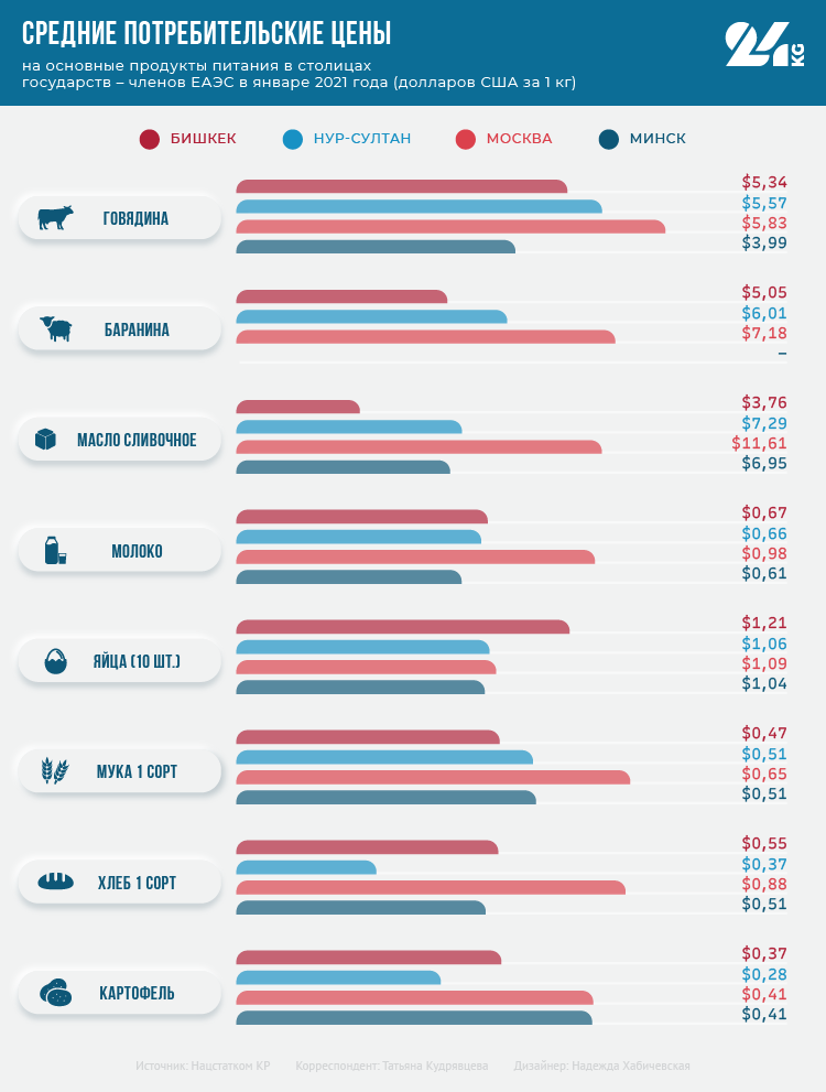 На бишкекскую зарплату можно купить почти в 2,5 раза меньше продуктов, чем на московскую. Самый большой разрыв — в возможности купить яйца (почти в 4 раза), а самый маленький — сливочное масло (в 1,1 раза).