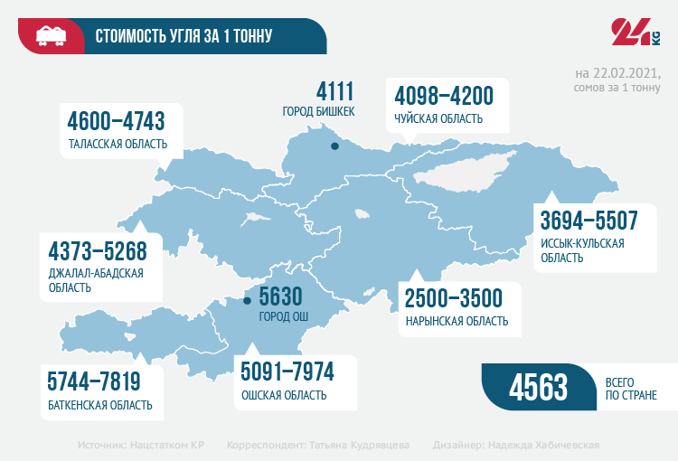 Дороже всего твердое топливо в Ноокате (7,9 тысячи сомов за тонну), Баткене (7,8 тысячи), Кара-Суу (5,8 тысячи) и Исфане (5,7 тысячи). Дешевле всего уголь в Балыкчи (3 тысячи 694,59 сома), Нарыне (3,5 тысячи) и селе Чаек (2,5 тысячи).