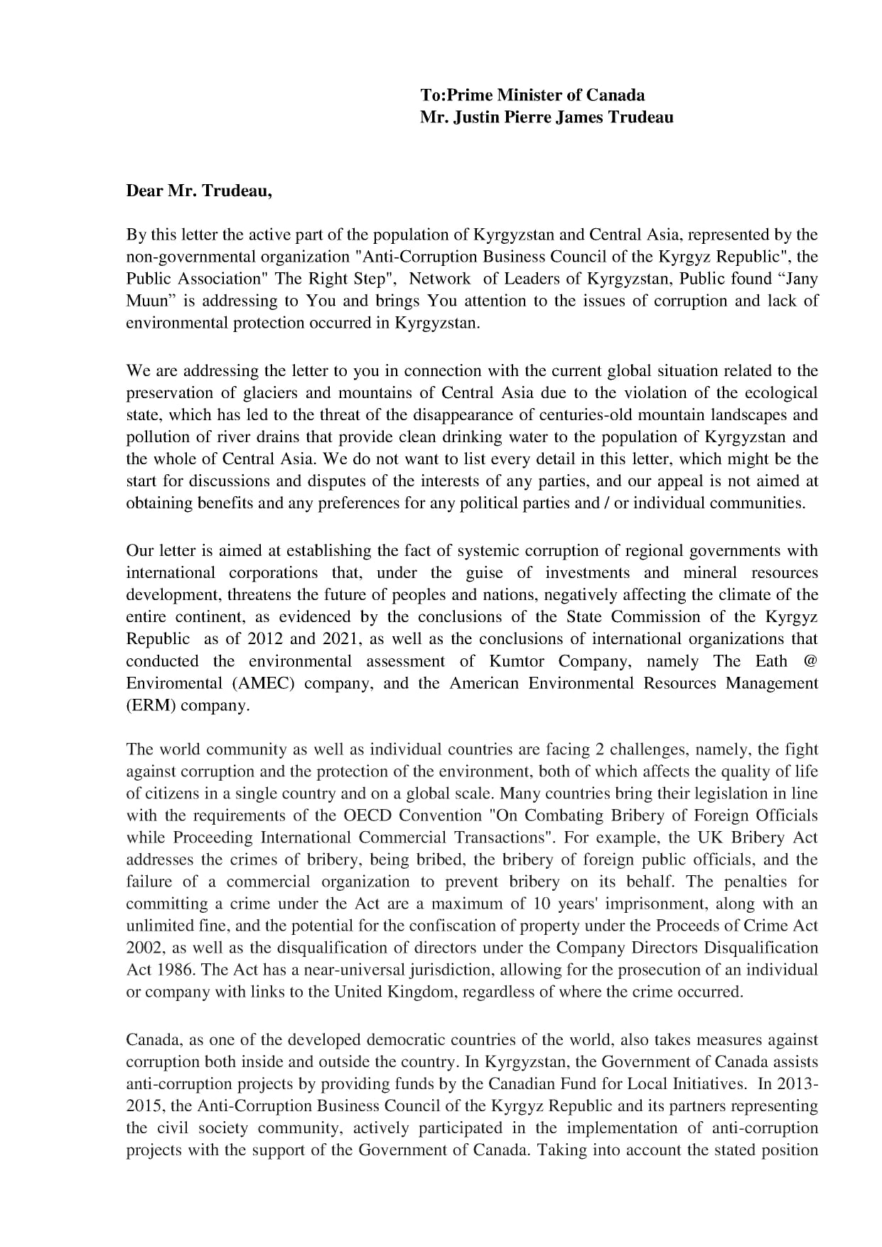 Письмо направили представители организации «Антикоррупционный деловой совет КР», общественного объединения «Правильный шаг», «Сети лидеров Кыргызстана», общественного фонда «Джаны Муун». Гражданские активисты обращают внимание главы правительства Канады на проблемы коррупции и отсутствия охраны окружающей среды в Кыргызстане.