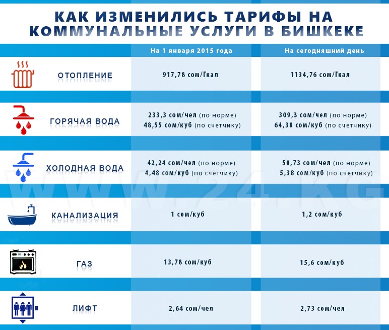 За 1 кубометр горячей воды в 2016-м будем платить по 80,29 сома по счетчику и 385,41 сома за человека по норме потребления. Рост тарифов составит 24,7 процента. В 2017-м горячая вода подорожает еще на 19,9 процента. Через два года тарифы составят 96,31 сома (по счетчику) и 462,27 сома (с человека по норме).