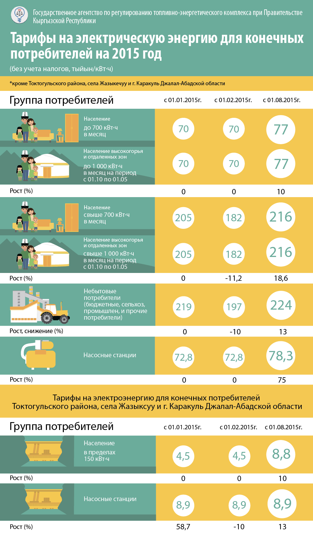 Но не остановятся на достигнутом и другие тарифы. Скрылись они в изменениях, внесенных еще 20 ноября 2014-го в постановление правительства «Об утверждении среднесрочной тарифной политики КР на электрическую и тепловую энергию на 2014-2017 годы». По ним в последующие два года нас ждет постоянное повышение цены на электричество. Для абонентов, потребляющих до 700 киловатт-часов, в 2016 году они вырастут до 93,2 тыйына (на 21 процент), в 2017-м – до 1,21 сома (на 29,8 процента).