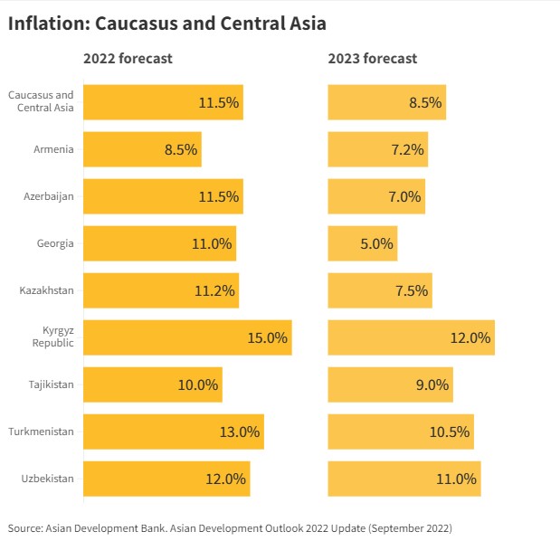 «Годовая инфляция в Кыргызстане за первые семь месяцев 2022 года достигла 13 процентов в основном за счет более высоких мировых цен на продукты питания и энергоносители, а также обесценения валюты по отношению к доллару США в марте и апреле. Ожидается, что инфляция останется высокой в текущем году, а затем немного замедлится в следующем», — отметили в АБР.