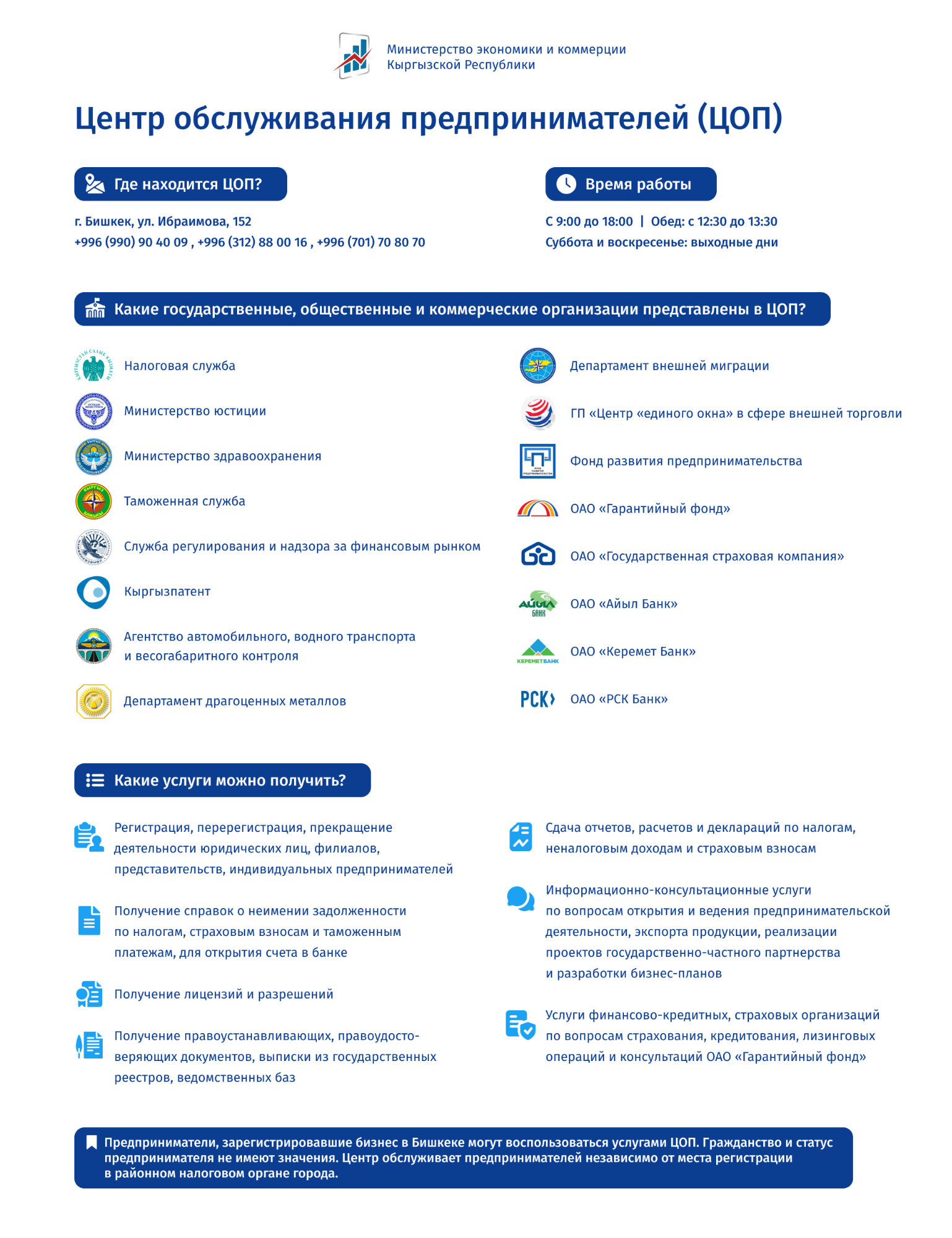 Для помощи бизнесу в Бишкеке работает Центр обслуживания предпринимателей (ЦОП). В нем созданы все условия для получения в полном объеме консультаций и государственных услуг.