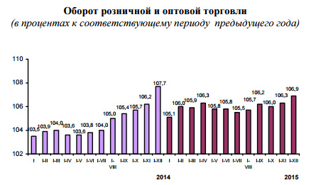 Однако есть в многострадальной кыргызской экономике сфера, которая из года в год показывает стабильный рост. Это услуги, а точнее – торговля. Сколько бы ни говорили о том, что нам давно надо больше производить, чем перепродавать, статистика показывает обратное. И 2015 год не стал исключением. Его итоги демонстрируют уверенный рост (6,9 процента) объемов оптовой и розничной торговли – до 428 миллиардов 72,9 миллиона сомов. Увеличение в основном связано с ростом продаж моторного топлива (на 23,1 процента) и розницы (на 5,6 процента).