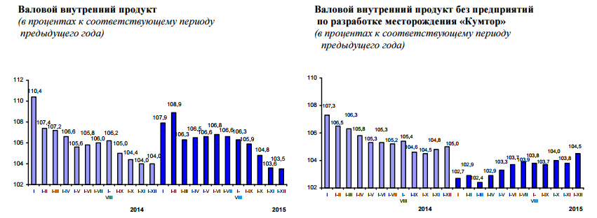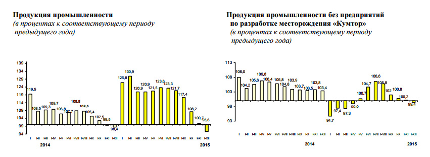 В Национальном статистическом комитете такие показатели связывают в основном со снижением объемов производства (на 8,2 процента) на Кумторе. Также значительное отставание от 2014 года наблюдалось в производстве текстиля (21,2 процента), одежды (12,8 процента), прочих неметаллических минеральных продуктов (10,9 процента) и электроэнергии (12,2 процента). Единственные показатели, которые радовали чиновников в 2015 году, это добыча металлических руд и производство нефтепродуктов. За год объем производства в этих отраслях вырос в 4,8 и 1,7 раза.