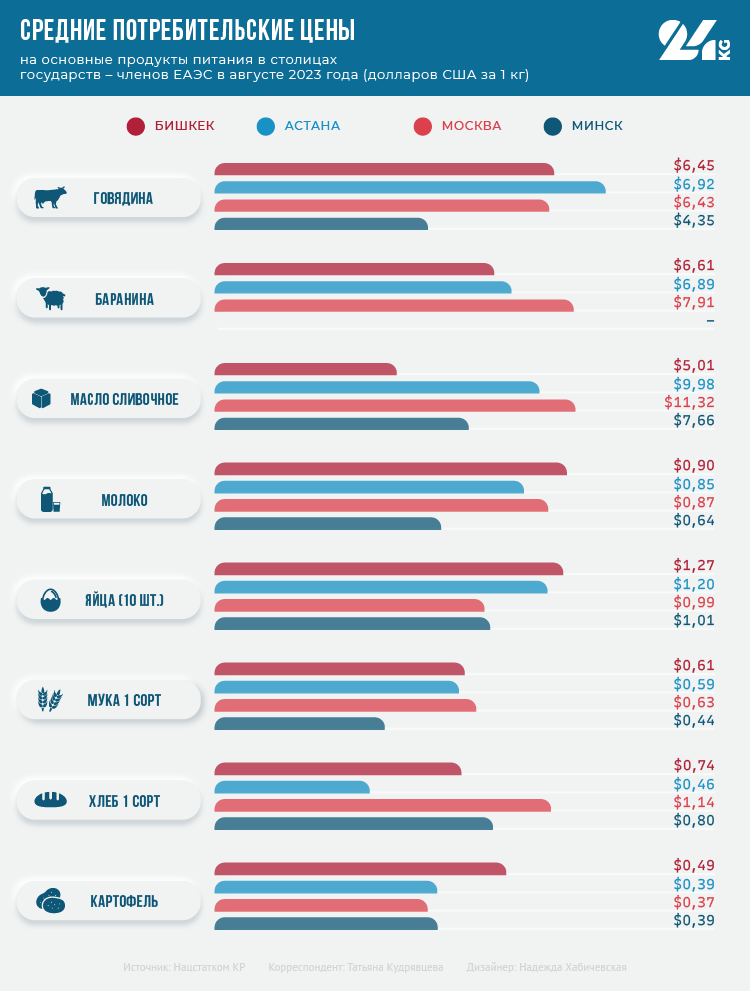 В августе картофель в Бишкеке был дороже на 20,4 процента, чем в Астане и Минске, и на 24,5 процента, чем в Москве. Стоимость хлеба из муки первого сорта была на 37,8 процента выше, чем в столице Казахстана. Говядина в Минске на 32,6 процента дешевле, чем в столице Кыргызстана.