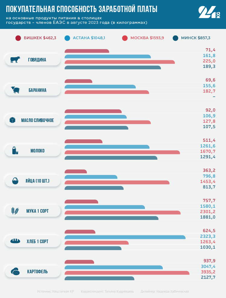 На бишкекскую заработную плату можно купить в 2,7 раза меньше продуктов, чем на московскую. Самый большой разрыв — в возможности купить картофель (в 4,2 раза), а самый меньший — в покупке сливочного масла (в 1,4 раза).