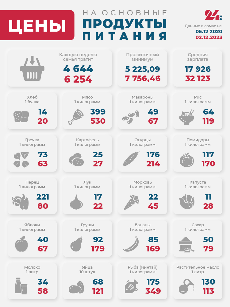 Мы считаем цены на продукты на семью на неделю. За четыре недели декабря в 2020-м наша семья потратила только на продукты 19 тысяч 14 сомов. Сегодня (с 11 ноября по 2 декабря 2023 года) эта цифра еще больше — 24 тысячи 825 сомов. Получается, что за три года расходы выросли на 5 тысяч 811 сомов.