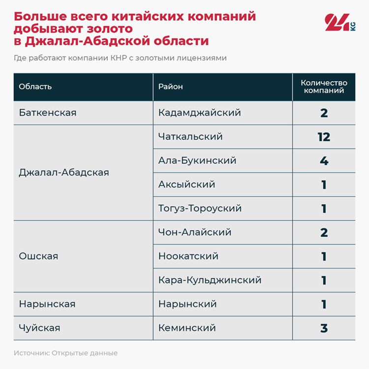 Среди учредителей или руководителей этих структур есть фирмы или граждане КНР. Оказалось, что подавляющее большинство работает в Джалал-Абадской области — 18 из 28.