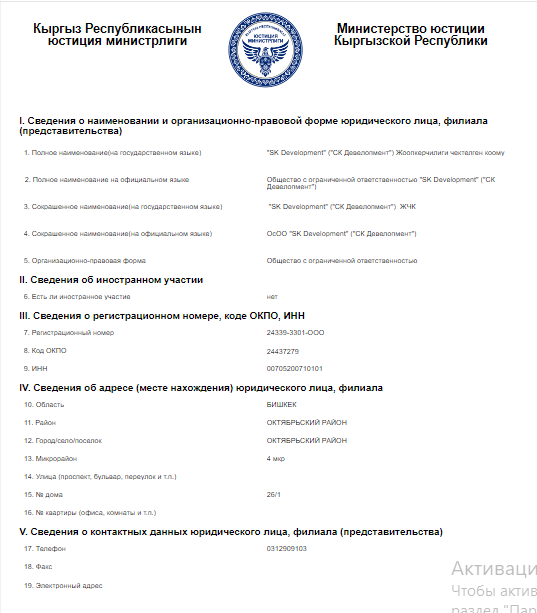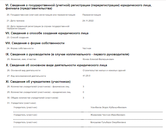 А теперь самое интересное — кто же занимается масштабной стройкой. SK Development работает на рынке Кыргызстана с 2007 года. Она успела реализовать несколько крупных проектов, в том числе построила и управляет сетью отелей «Каприз», реконструировала и управляет кинотеатром «Россия» в Бишкеке.По данным Министерства юстиции, руководителем SK Development является Алексей Конев, учредителями — Элдос Усенбеков, Чингиз Жумалиев и Гульбара Бокушова. Перерегистрацию компания прошла в ноябре 2022 года. Получается, это случилось почти сразу после начала строительства гольф-клуба.