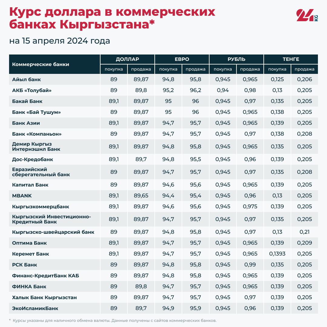 Курс доллара в коммерческих банках Кыргызстана на 15 апреля