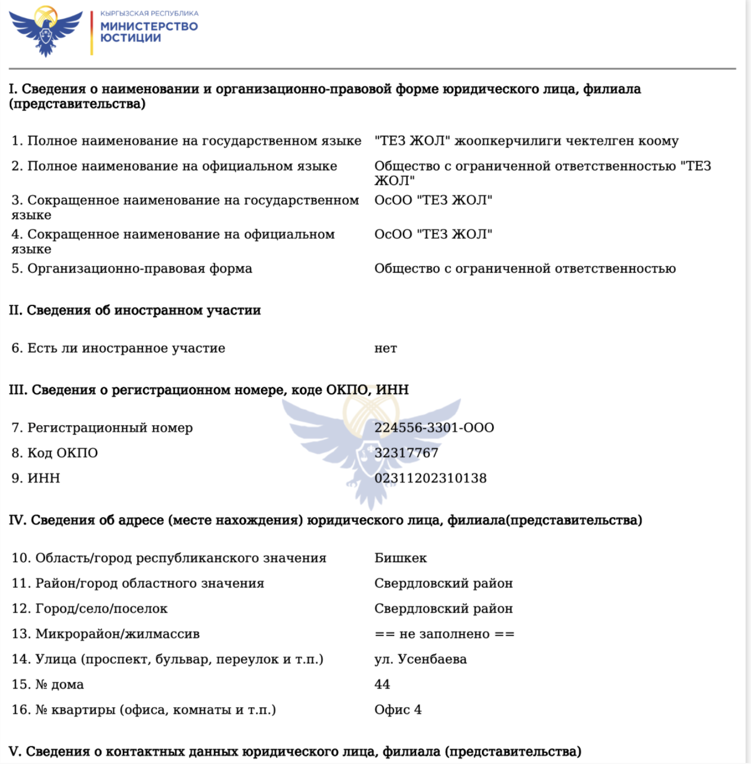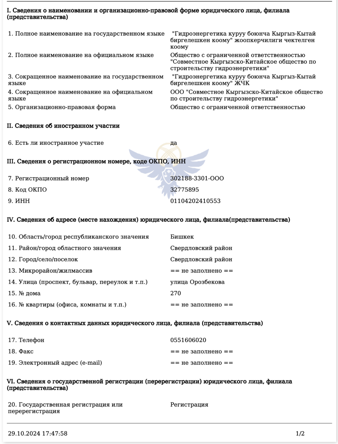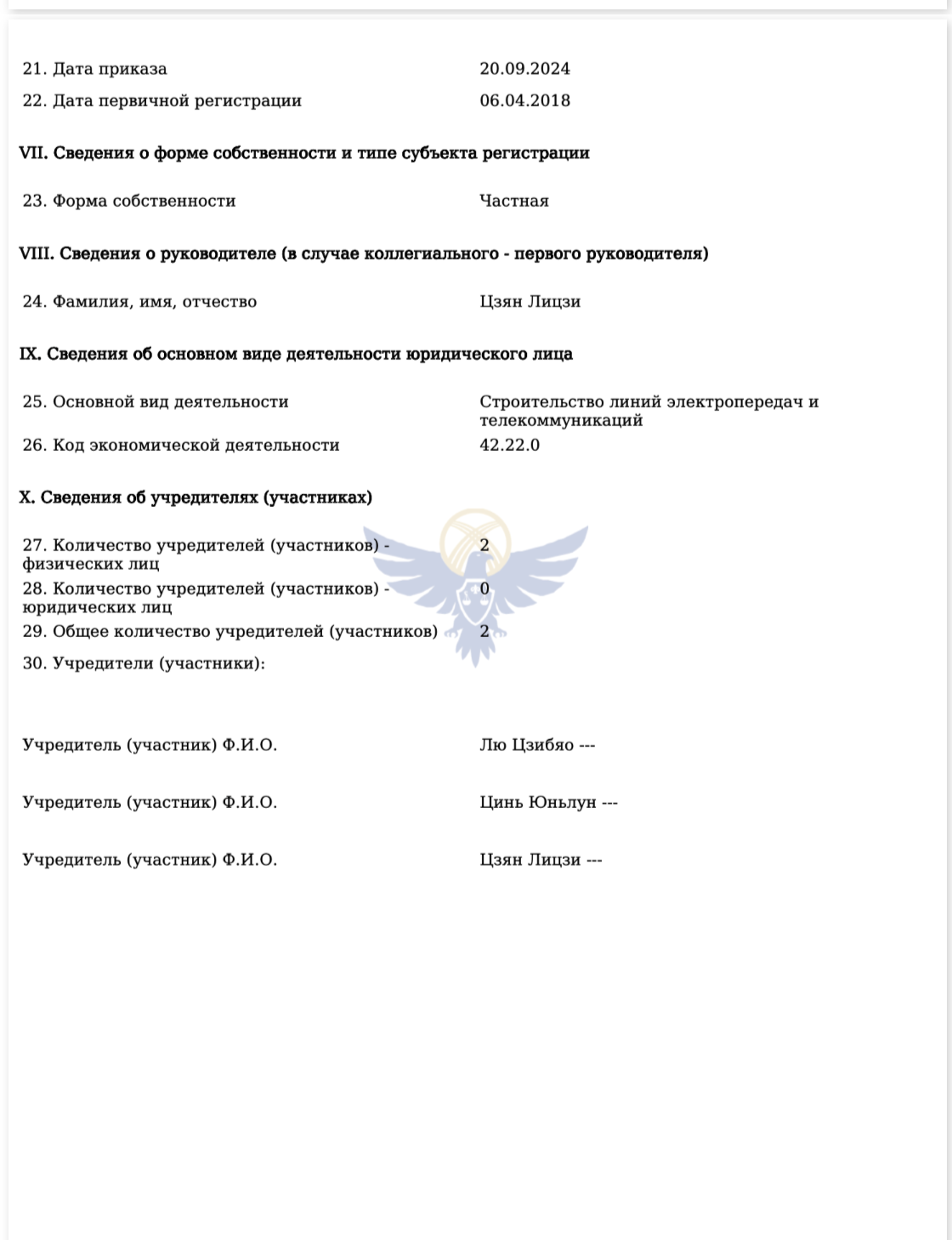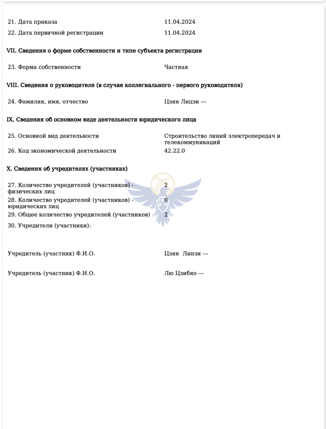 Несмотря на название компании, в учредителях нет граждан Кыргызстана, только Китая — Цзян Линзи и Лю Цзибяо. Основной вид деятельности компании — строительство линий электропередачи и телекоммуникационных сетей. Первичную регистрацию она прошла 11 апреля 2024 года.
