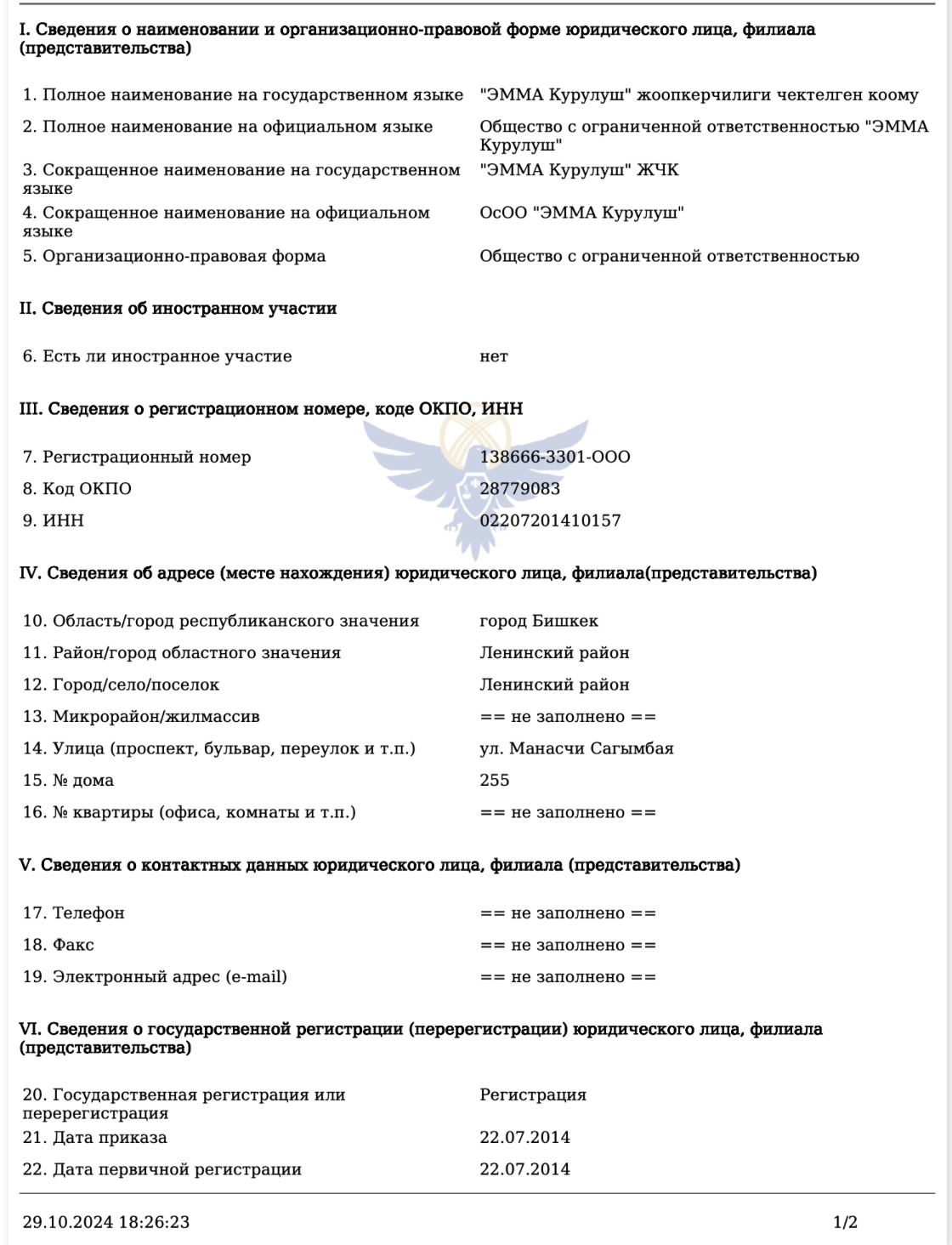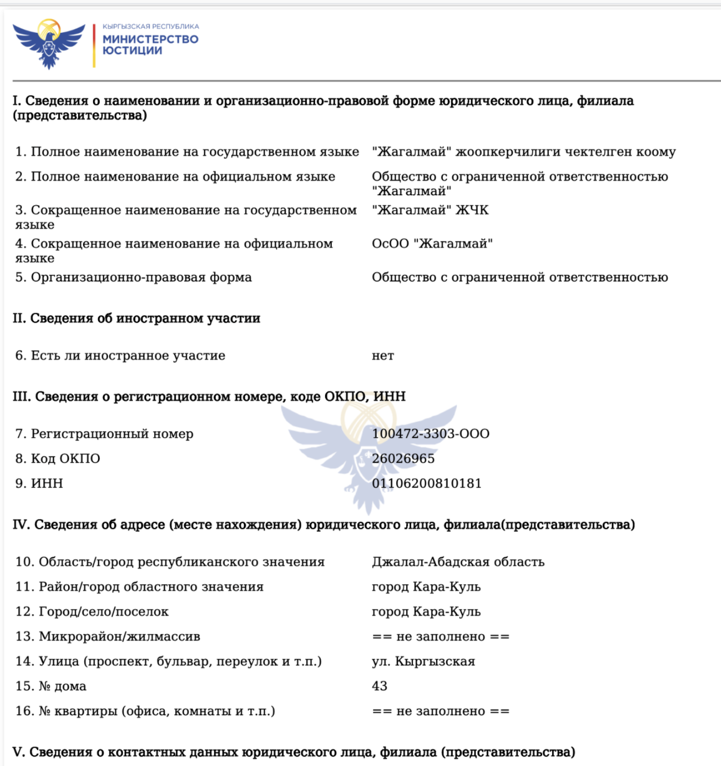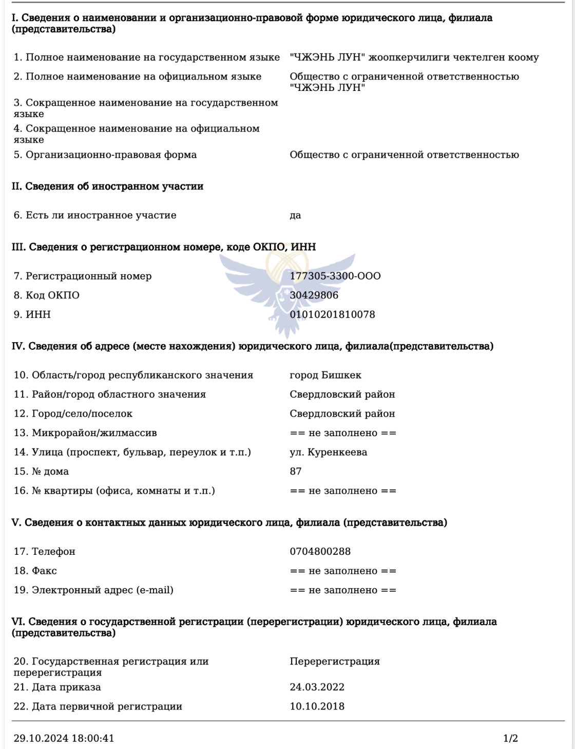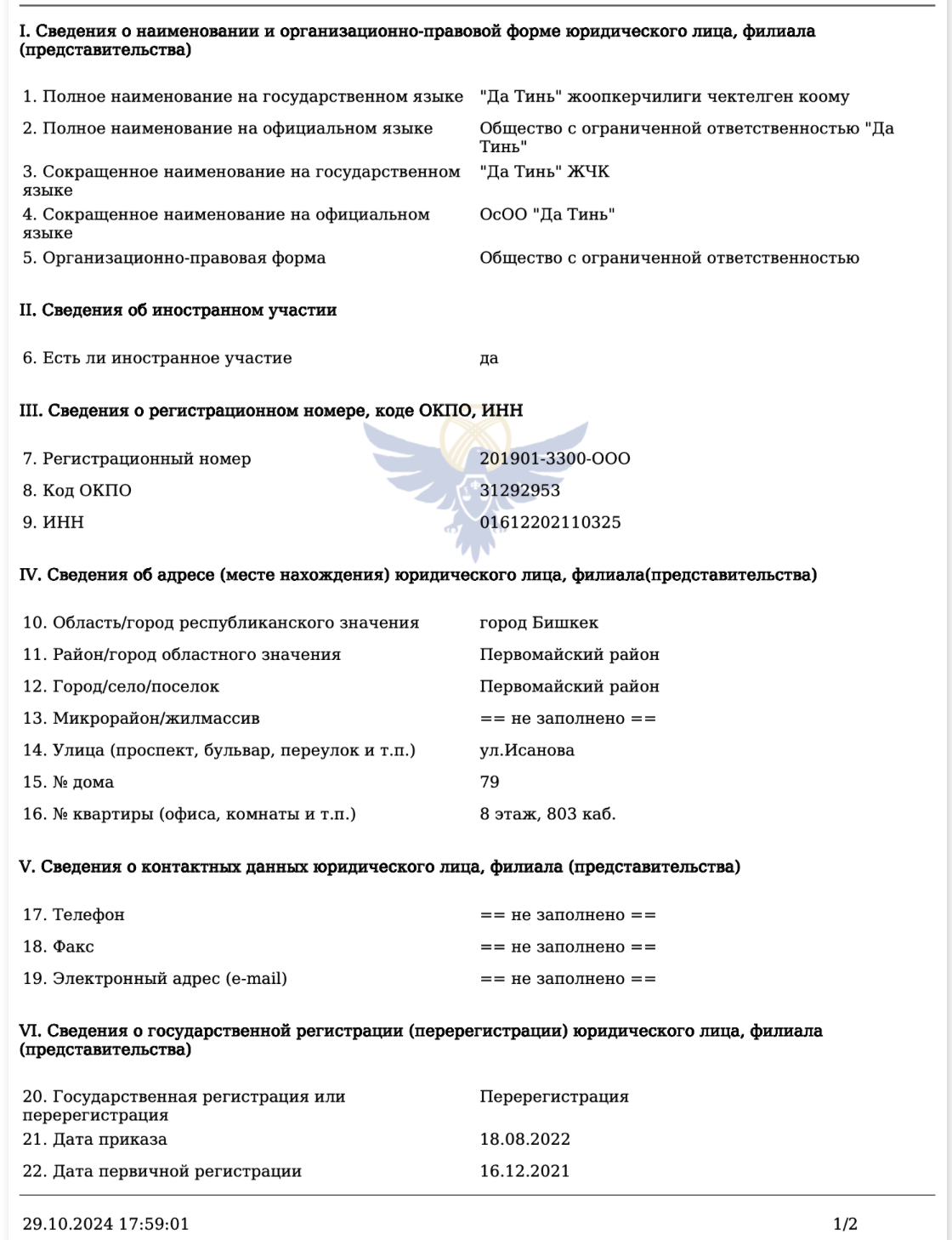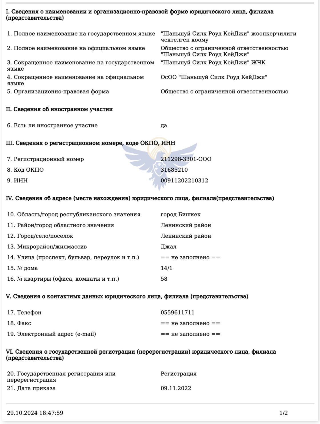 Несмотря на название компании, в учредителях нет граждан Кыргызстана, только Китая — Цзян Линзи и Лю Цзибяо. Основной вид деятельности компании — строительство линий электропередачи и телекоммуникационных сетей. Первичную регистрацию она прошла 11 апреля 2024 года.