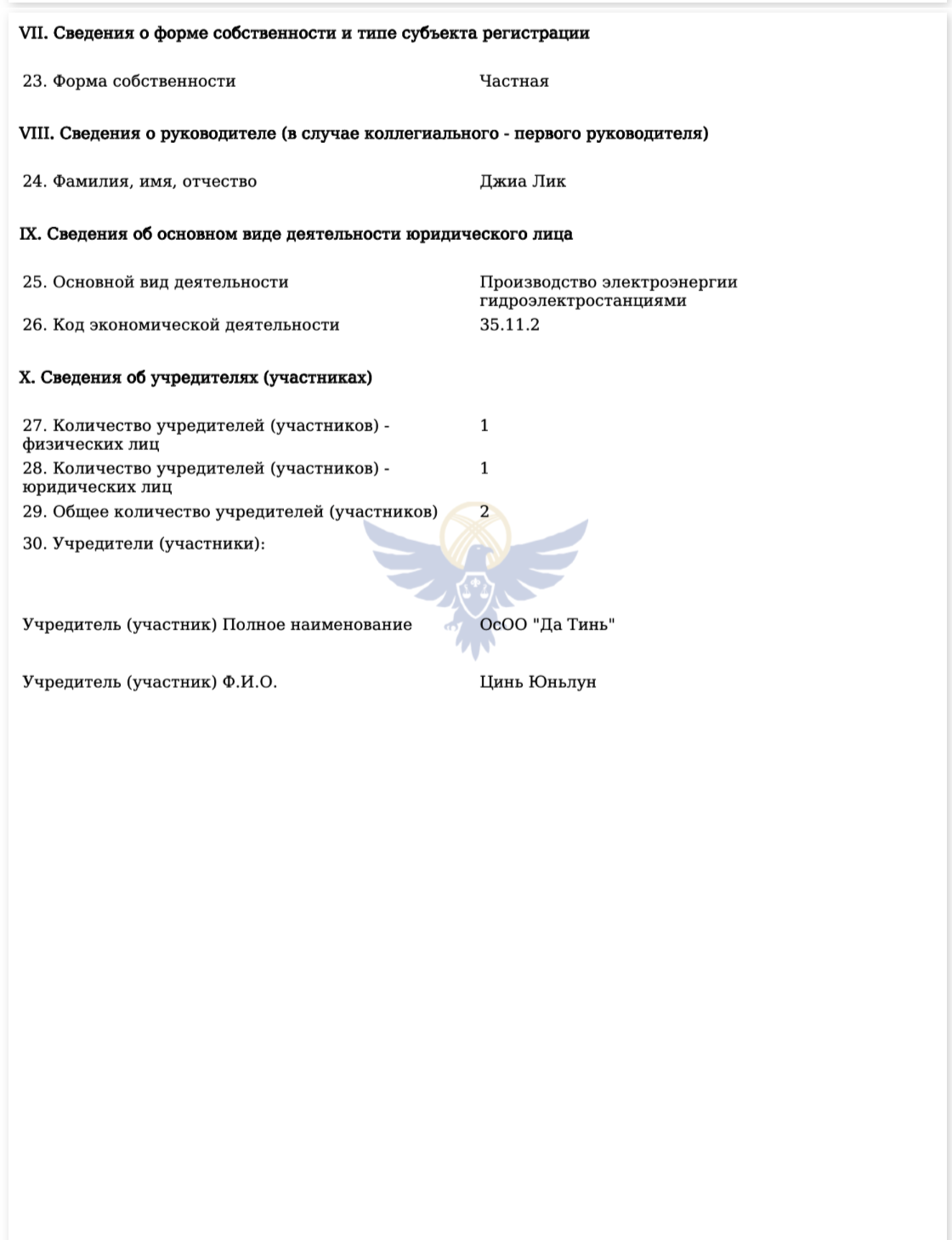Кроме того, в Минюсте зарегистрированы два ОсОО «Совместное Кыргызско-китайское общество по строительству гидроэнергетики». Дата первичной регистрации — 6 апреля 2018 год, и в ней три учредителя – Лю Цибяо, Цинь Юньлун и Цзян Лицзи. Цинь Юньлун также числится учредителем в двух компаниях по производству электроэнергии ОсОО «Да Тинь» и «Чжэнь Лун» , где директор Джиа Лик.