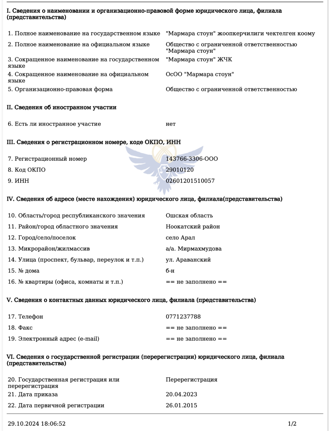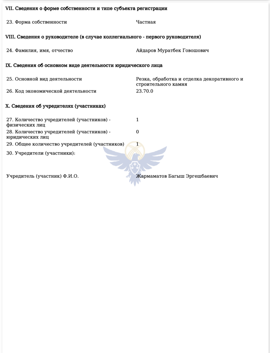 По информации Минюста, руководителем компании является Муратбек Айдаров, учредителем – боец ММА Багыш Жармаматов. Компания занимается резкой и обработкой декоративного и строительного камня.
