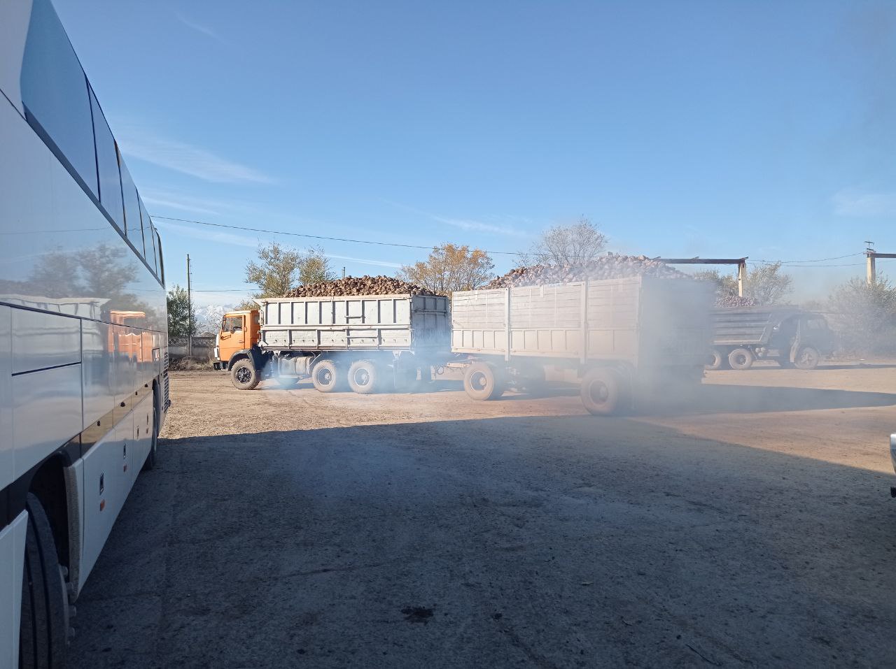 собрать как можно больше. Если снова пойдут осадки, трактора не заедут на поля. Один грузовик, наполненный доверху, уже уехал на пункт приема. А трактор с прицепом продолжает складывать собранную свеклу на краю поля. Горы овощей будут дожидаться грузовика на следующий день. Нанять одновременно несколько большегрузов, чтобы скорее увезти собранный урожай, не всегда получается — на полях задействована практически вся техника Чуйской области. Очереди на пунктах приема