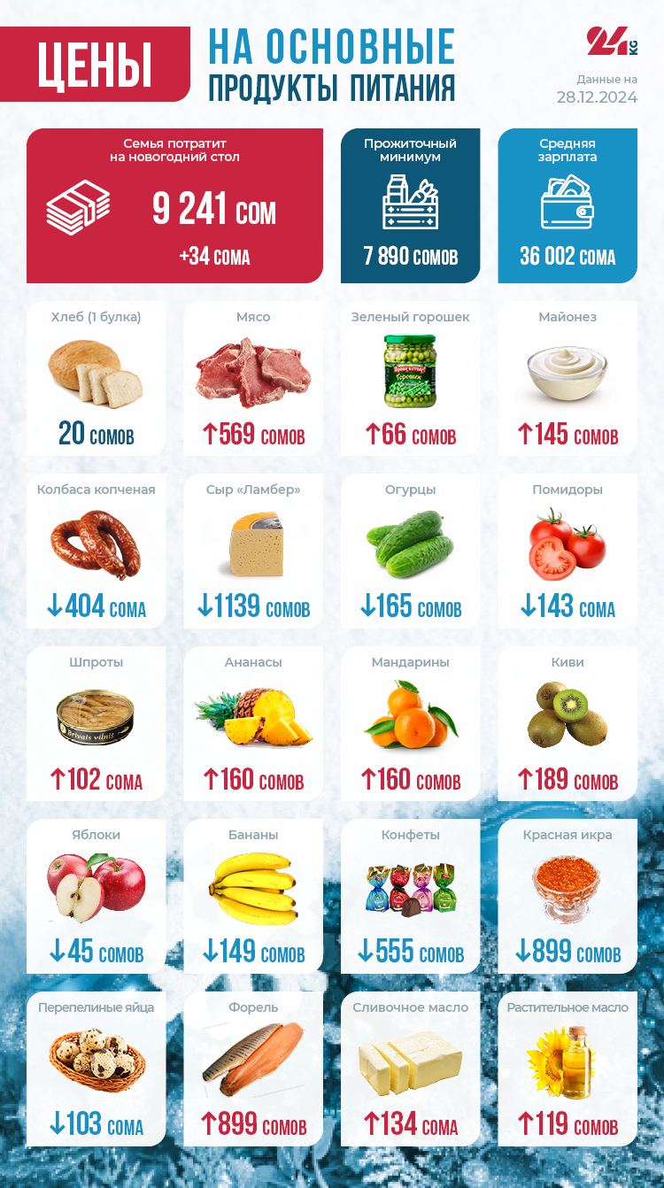 В преддверии Нового года мы немного изменили набор продуктов нашей корзины. 24-kg.com рассчитало среднюю потребительскую праздничную корзину для Бишкека.