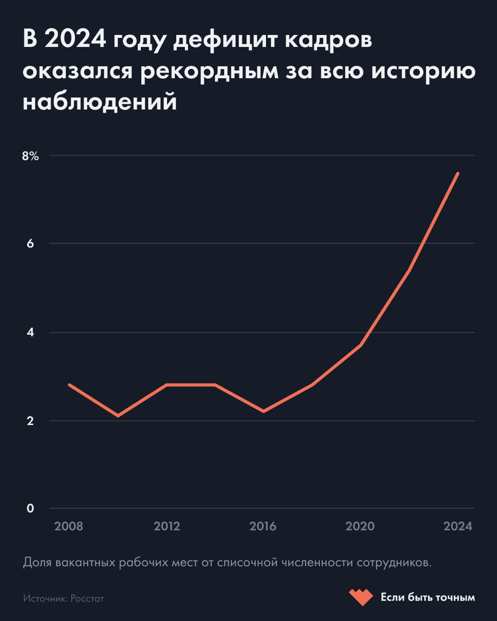 В 2024-м российским компаниям не хватало 2,2 миллиона работников — 7,6 процента от общего числа жителей. Это самый большой дефицит кадров за всю историю наблюдений с 2008 года. Например, в 2022-м он составлял 5,4 процента, а в 2020 году — 3,7 процента.