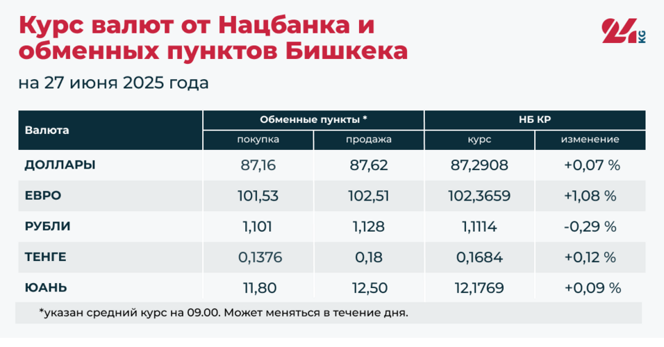 - Официальный курс НБ КР: 87,2908 сома (рост на 0,07 процента).