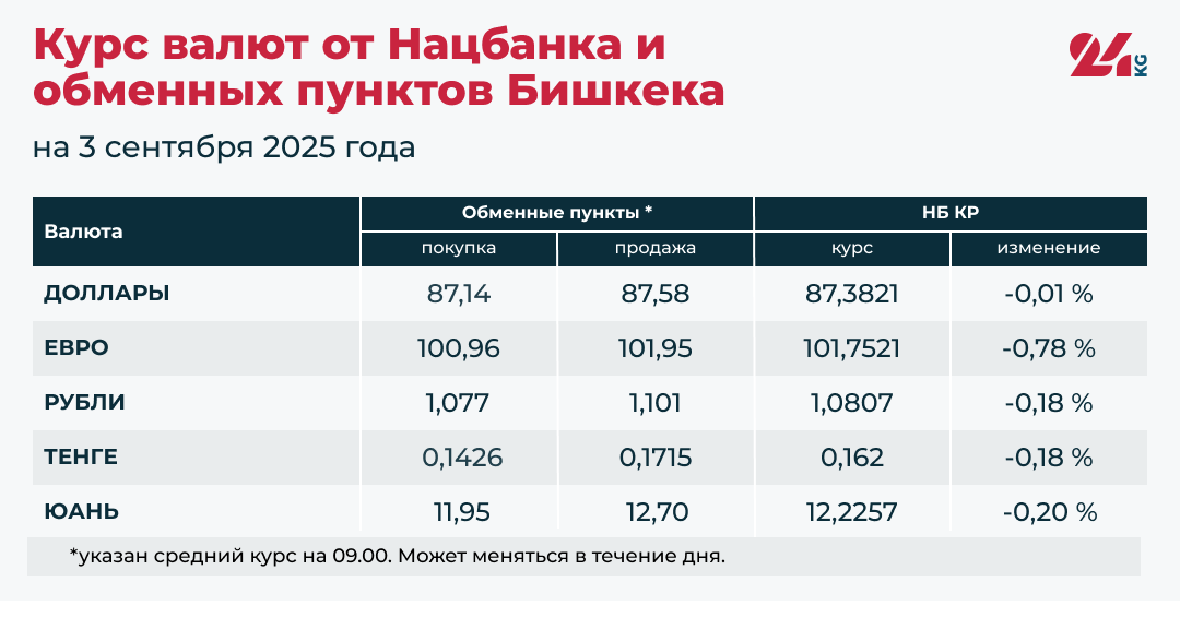 - Средний курс в обменных пунктах: покупка — 87,14 сома, продажа — 87,58 сома.