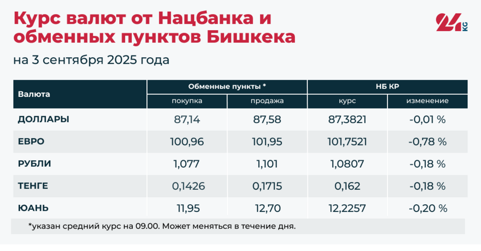 - Официальный курс НБ КР: 1,0807 сома (снижение на 0,18 процента). Обновлен минимум сентября.