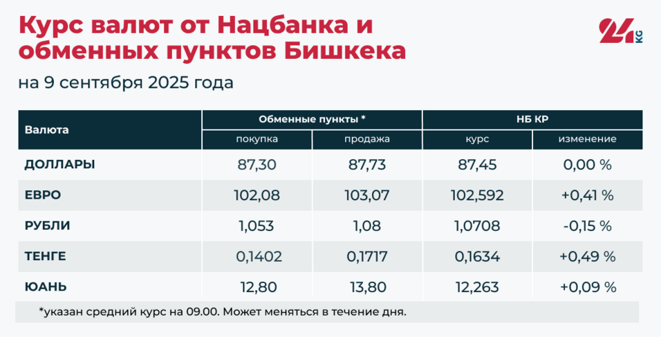 - Официальный курс НБ КР: 12,263 сома (рост на 0,09 процента). Тренд: +0,5 процента за сентябрь.