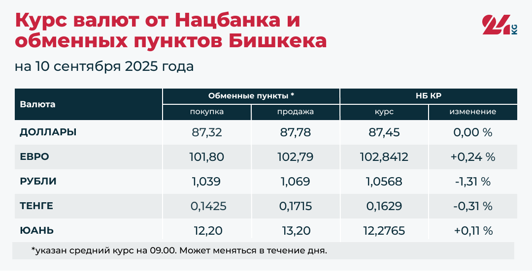 - Официальный курс НБ КР: 102,8412 сома (рост на 0,24 процента). Максимум с начала августа. Причина — ослабление доллара на мировых рынках.