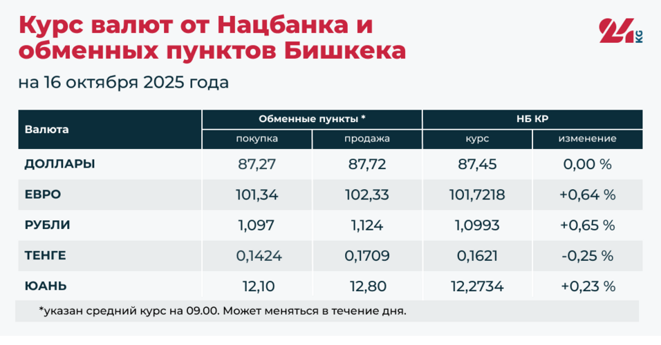 • Средний курс в обменных пунктах: покупка — 87,27 сома, продажа — 87,72 сома.