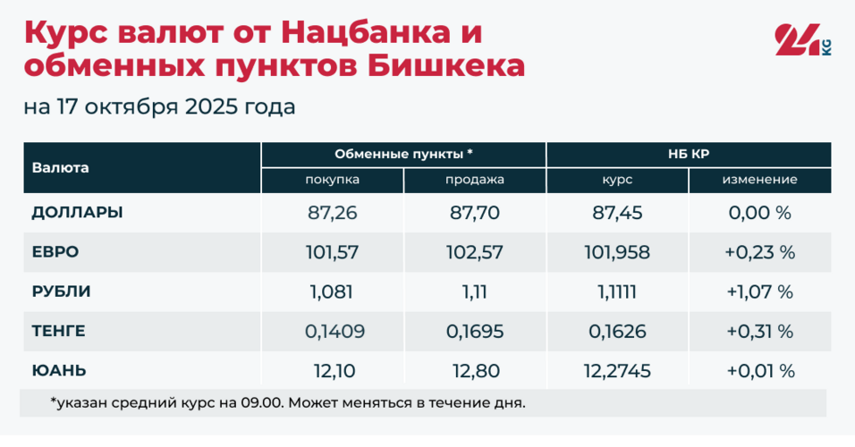 - Официальный курс НБ КР: 87,45 сома (без изменений).
