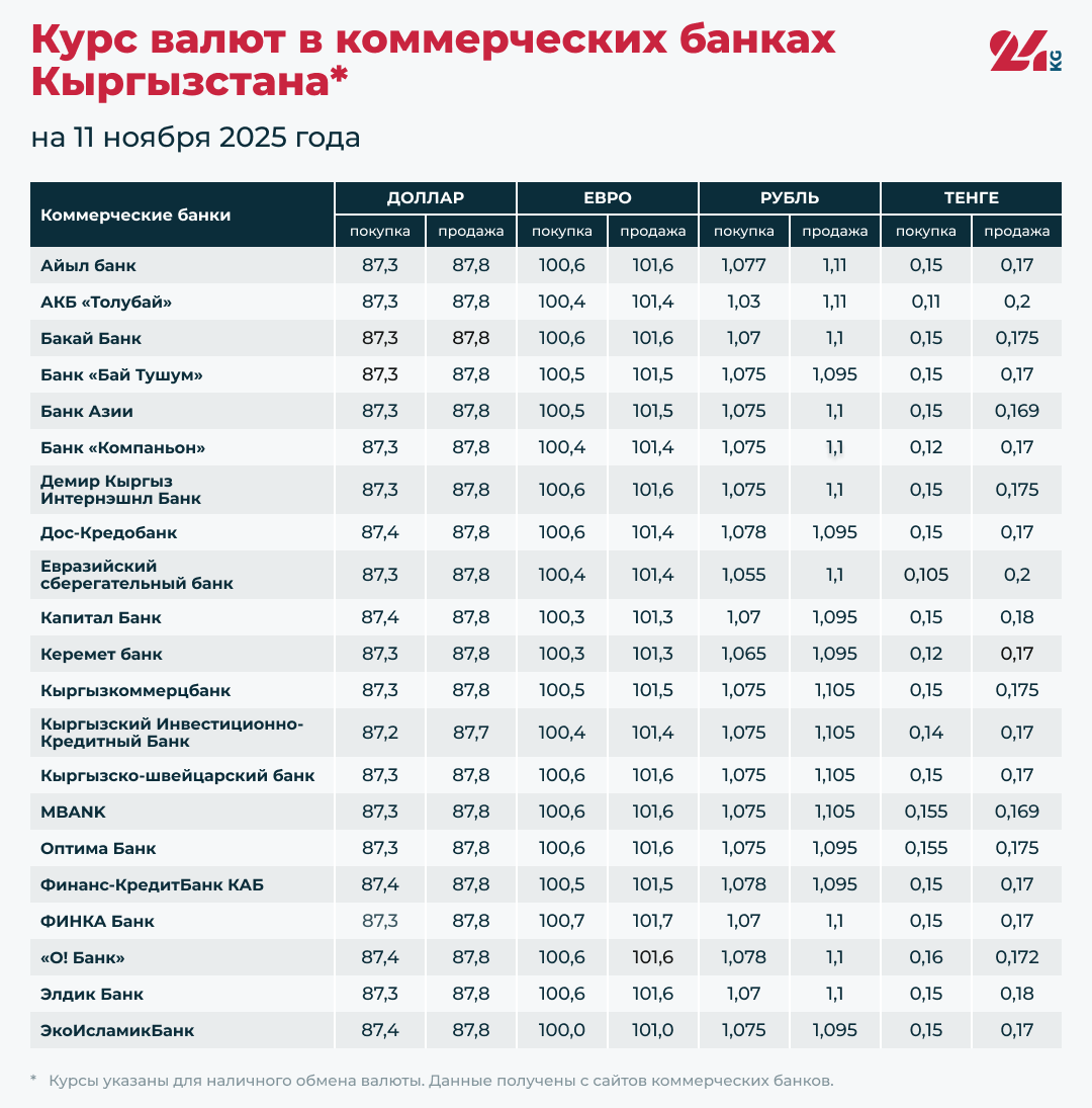 Курс валют в коммерческих банках Кыргызстана на 11 ноября
