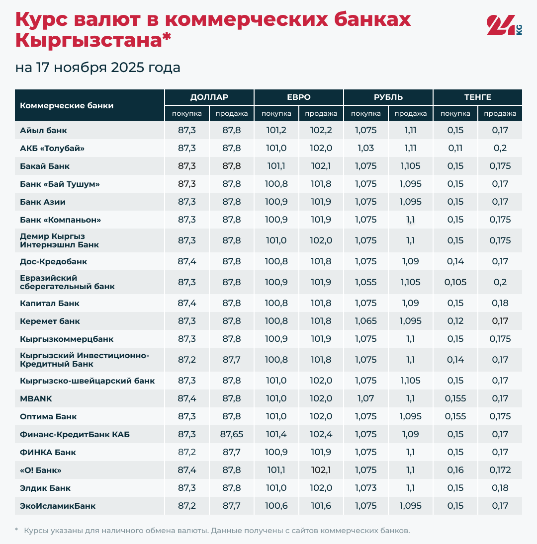 Курс валют в коммерческих банках Кыргызстана на 17 ноября