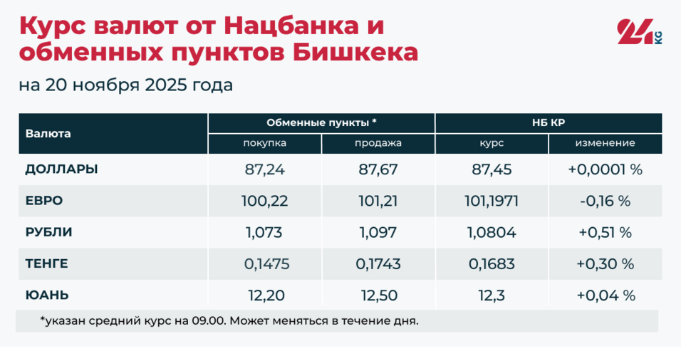 • Средний курс в обменных пунктах: покупка — 87,24 сома, продажа — 87,67 сома.