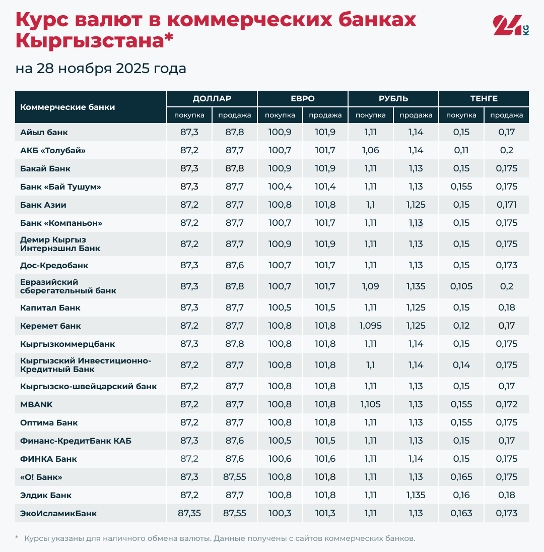 Курс валют в коммерческих банках Кыргызстана на 28 ноября