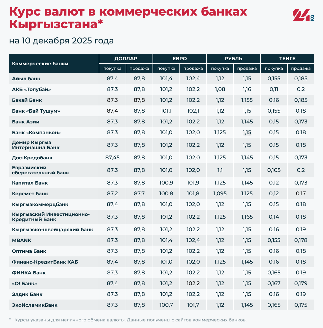 Курс валют в коммерческих банках Кыргызстана на 10 декабря
