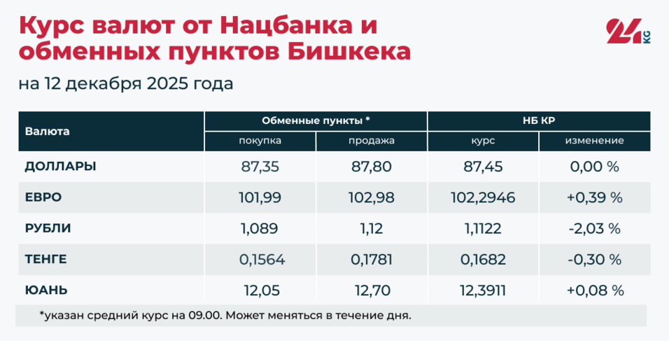 • Средний курс в обменных пунктах: покупка — 12,05 сома, продажа — 12,7 сома.