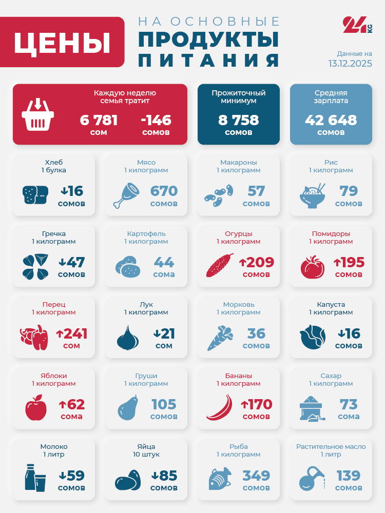 24-kg.com продолжает еженедельный мониторинг цен на минимальный набор продуктов. За вторую неделю декабря стоимость минимального набора продуктов выросла на 146 сомов — до 6 тысяч 781 сома.
