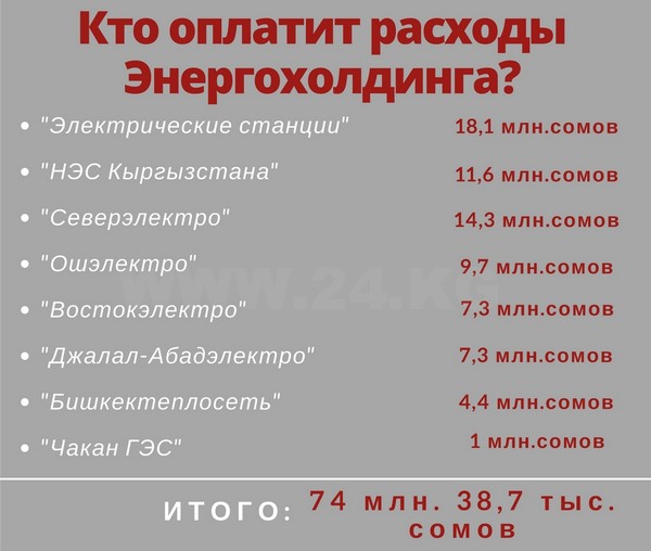 На содержание энергохолдинга из этих средств перепадет только 70 миллионов сомов. Около 20 миллионов сомов потратят на покупку компьютеров и мебели.