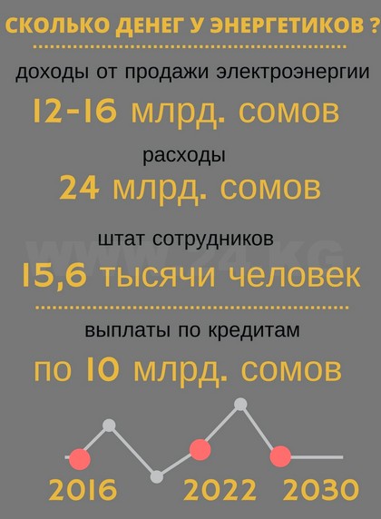 При самом неблагоприятном прогнозе, отдав 10 миллиардов сомов на погашение кредитов, отрасли останется только 2 миллиарда сомов на содержание 15,6 тысячи энергетиков, подготовку к отопительному сезону и текущий ремонт.