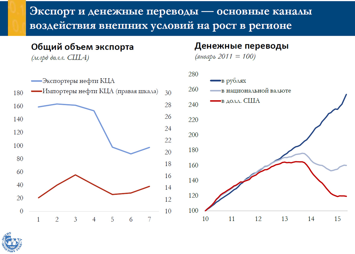 Самым главным для успешного выхода из кризиса МВФ считает необходимость структурных изменений. Проблемы есть как у экспортирующих нефть стран из-за их зависимости от стоимости сырья, так и у импортеров нефтепродуктов из-за высокой доли денежных переводов в структуре ВВП. Именно от данной зависимости МВФ рекомендует уходить.