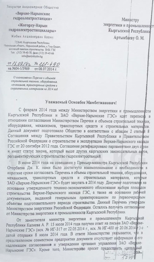 Скандальные разборки с ЗАО «Верхненарынские ГЭС»