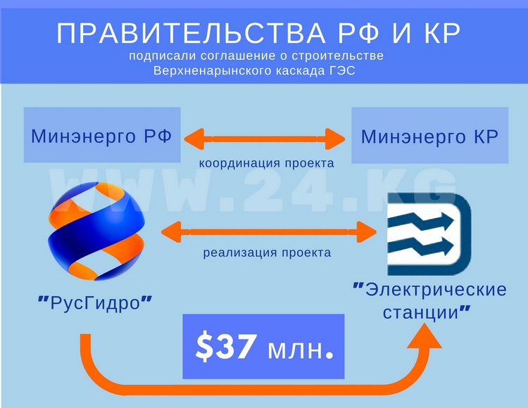 Они утвердили ЗАО «Верхненарынские гидроэлектростанции» с распределением долей в уставном капитале 50×50 между ОАО «Электрические станции» и «РусГидро». На компании возложена реализация проекта.