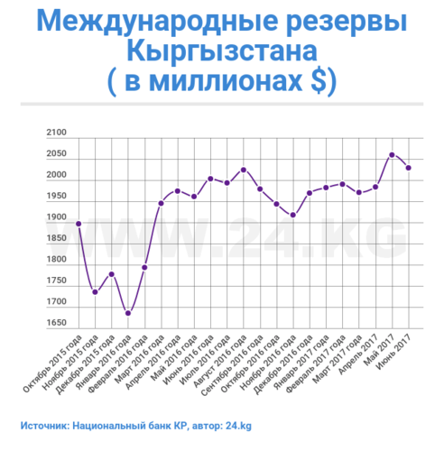 Отметим, что международные резервы Национальный банк тратит на сглаживание резких колебаний курса национальной валюты. В июле НБ КР из-за резкого роста курса доллара вынужден был дважды выходить на валютный рынок с интервенциями.