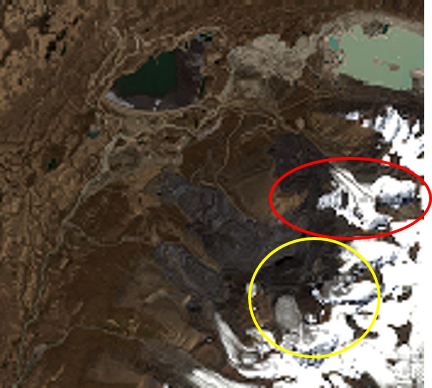 Фото из личного архива Дмитрия Петракова. Космический снимок «Сентинел» от 31 августа 2017 года. Ледник Лысый обведен красным, видно, что работ на нем нет. Черное пятно ниже него — зона разгрузки льда, перемещаемого с ледника Давыдова, который обведен желтым. В верхней части все его три ветви живы, их не собираются убирать полностью. На месте языка — карьер, ниже него — зона отвалов, в которой также есть лед